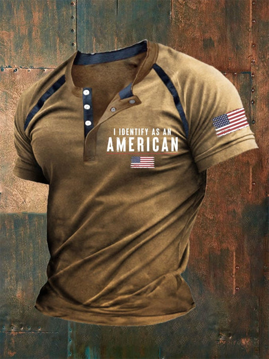 Men'sVintage American Flag Print Henley Collar T-Shirt