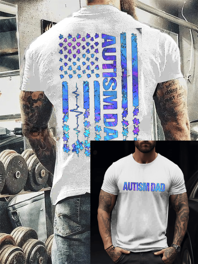 Men's Retro Autism Puzzle Piece American Flag Autism Awareness Printed Round Neck T-Shirt