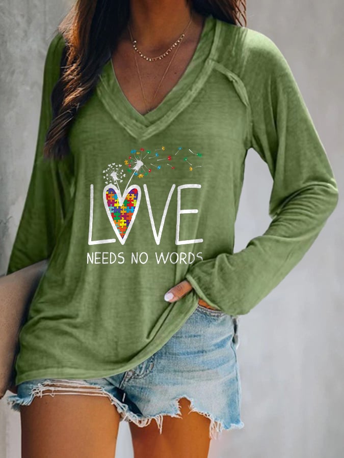 V-neck Autism Awareness Love Needs No Words Print T-Shirt