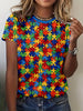 Women's Autism Geometric Color Puzzle Print Round Neck T-Shirt
