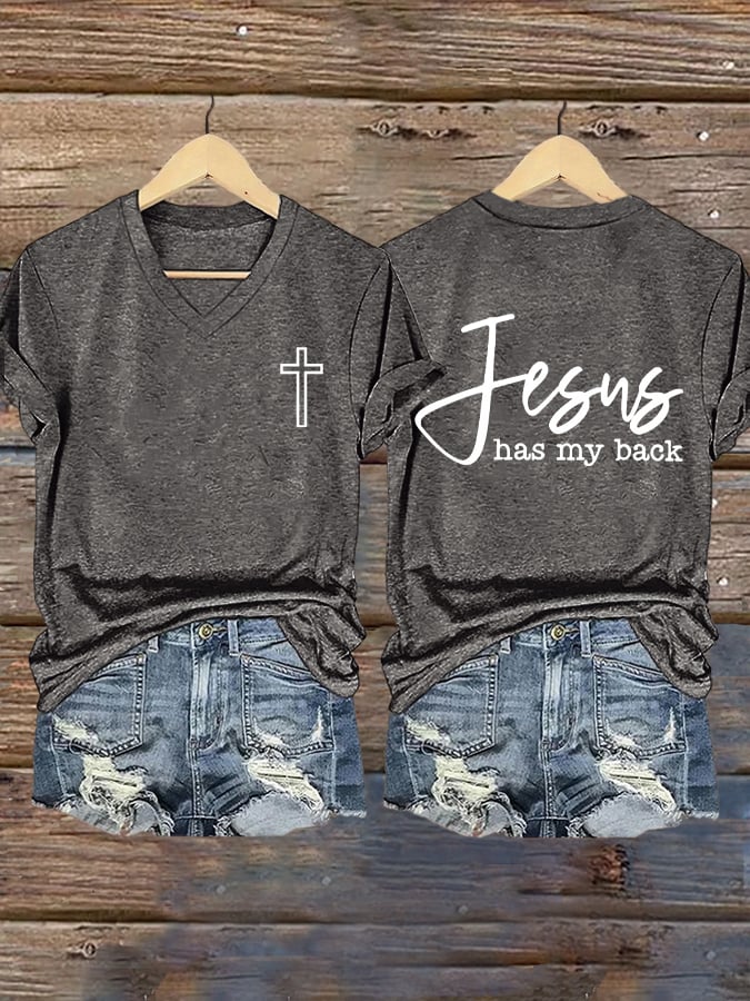 Women's Jesus Has My Back Printed Casual V-Neck T-Shirt