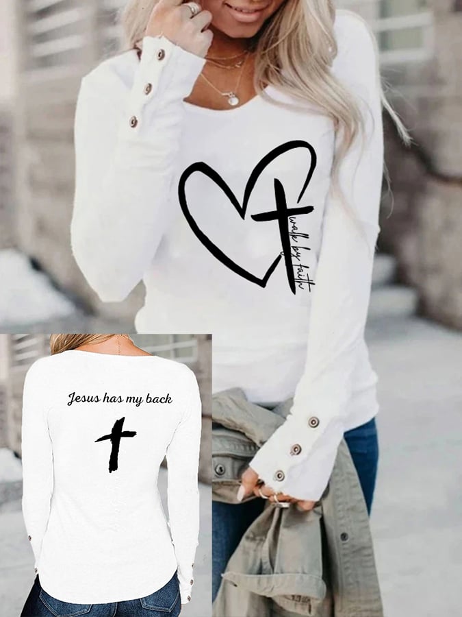 Women's Love Cross Walk By Faith Jesus Has My Back Print Button Top