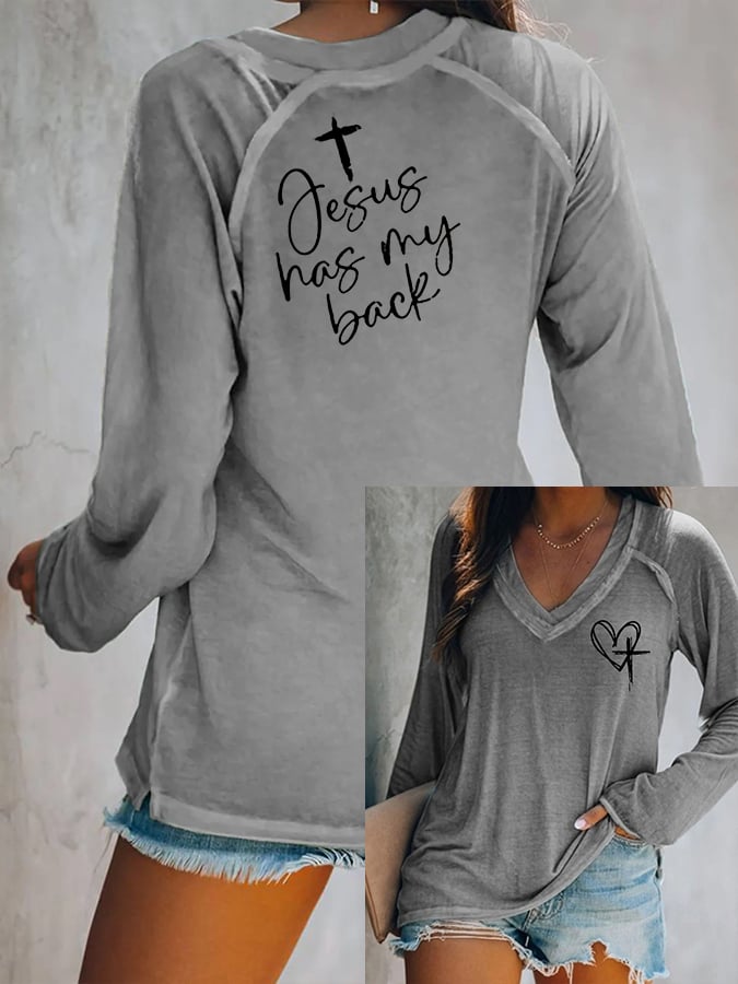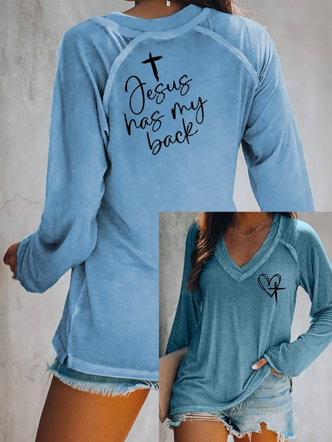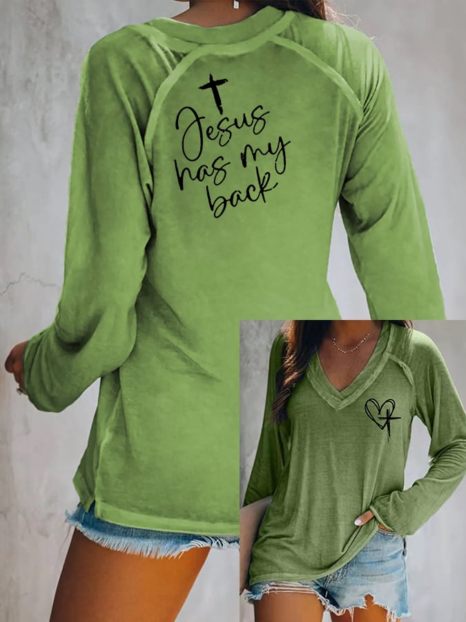 Women's Love Like Jesus Jesus Has My Back Casual V-Neck Long-Sleeve T-Shirt