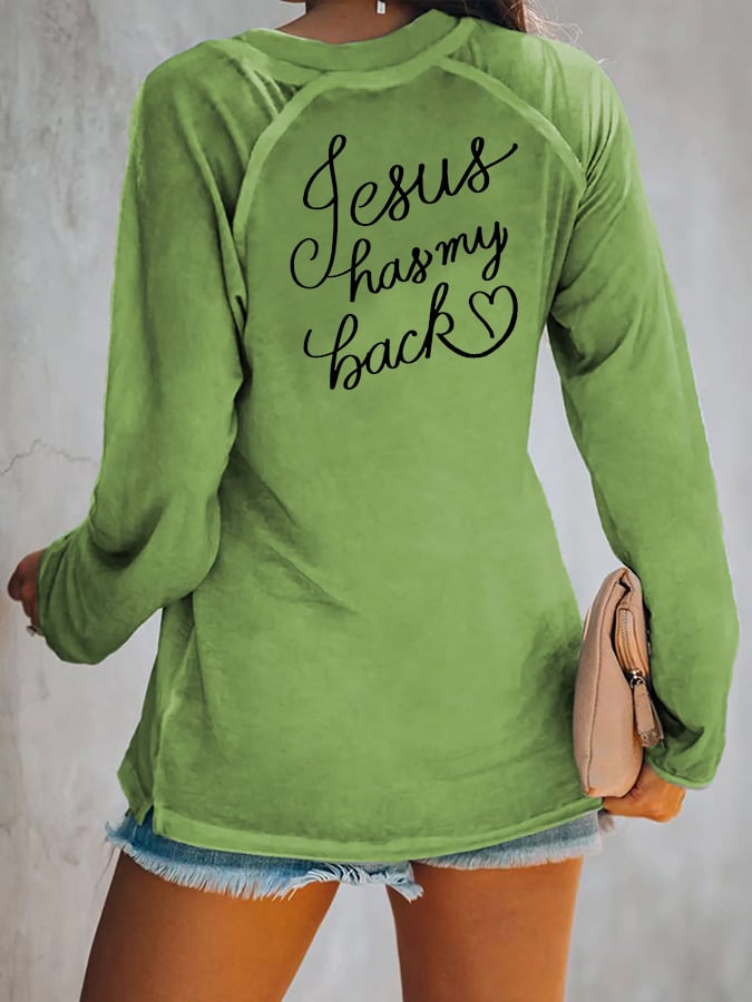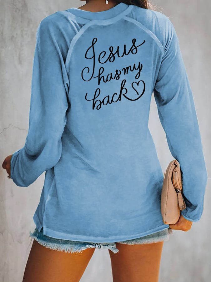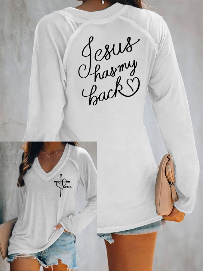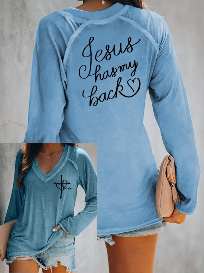 Women's Love Like Jesus Jesus Has My Back Casual V-Neck Long-Sleeve T-Shirt