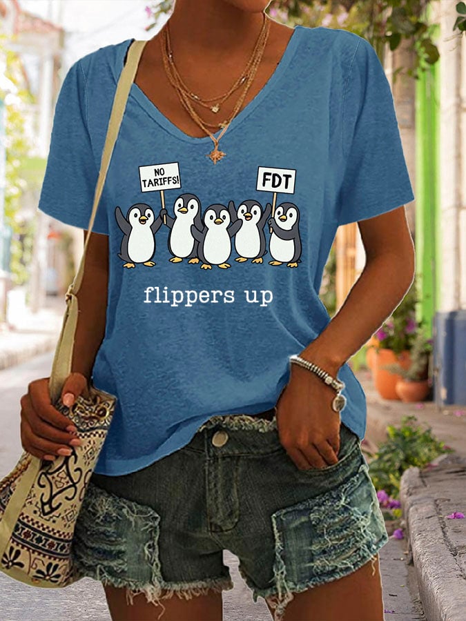 Women's Penguins Flippers Up Print V Neck Casual T-Shirt