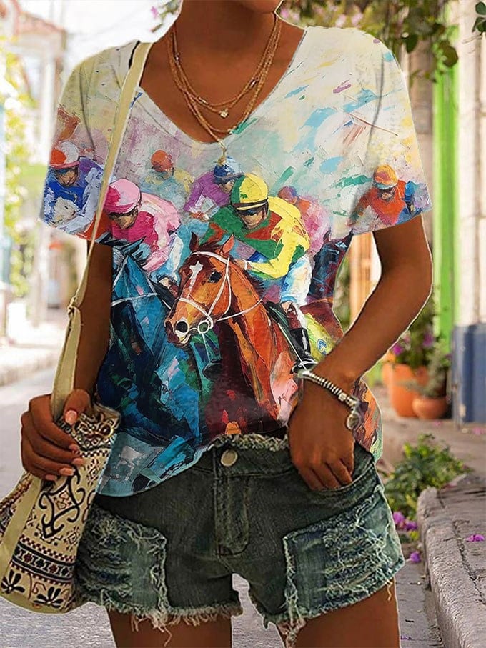Women's Racing Horses Kenturky Print V-Neck T-Shirt