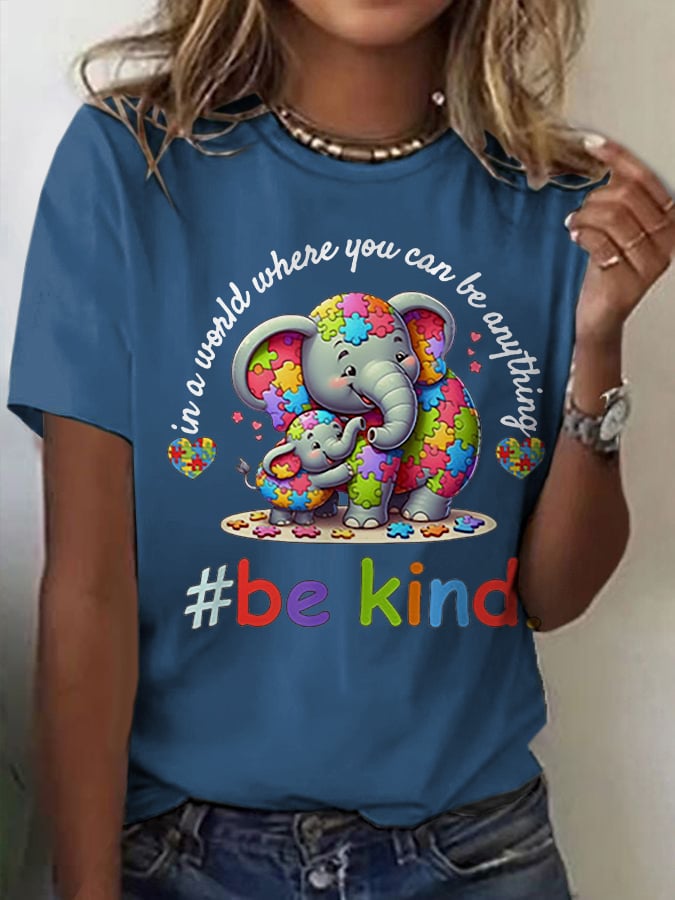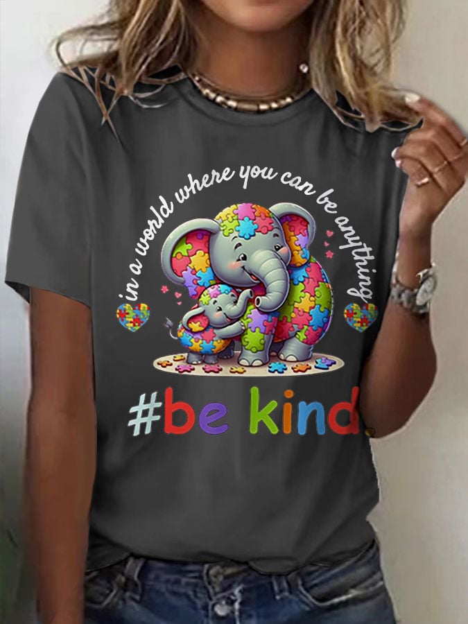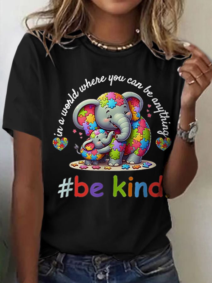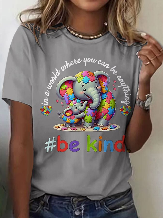 Women's Retro Be Kind Autism Awareness Elephant Print Round Neck T-Shirt