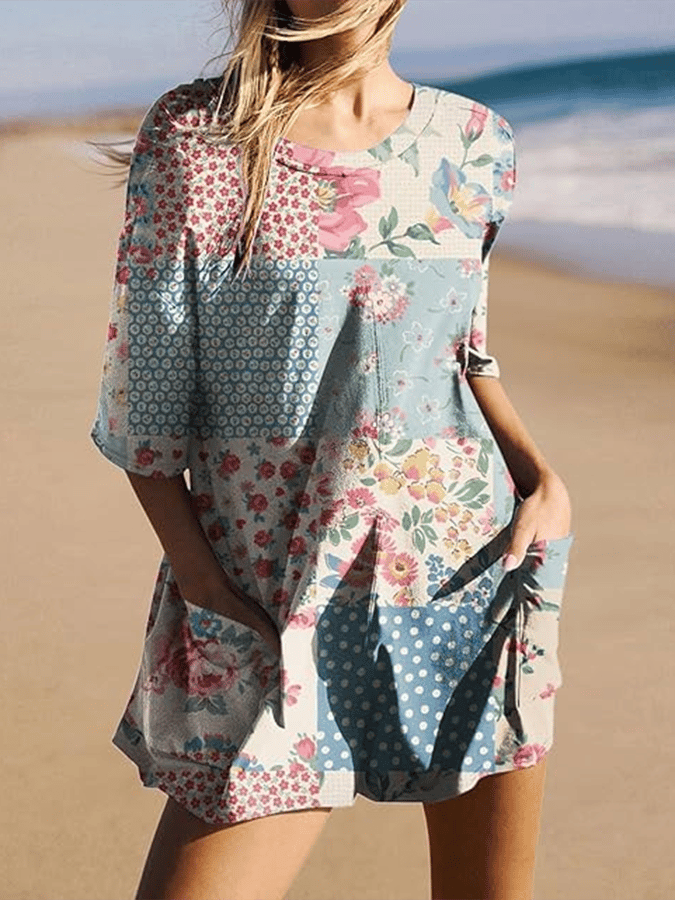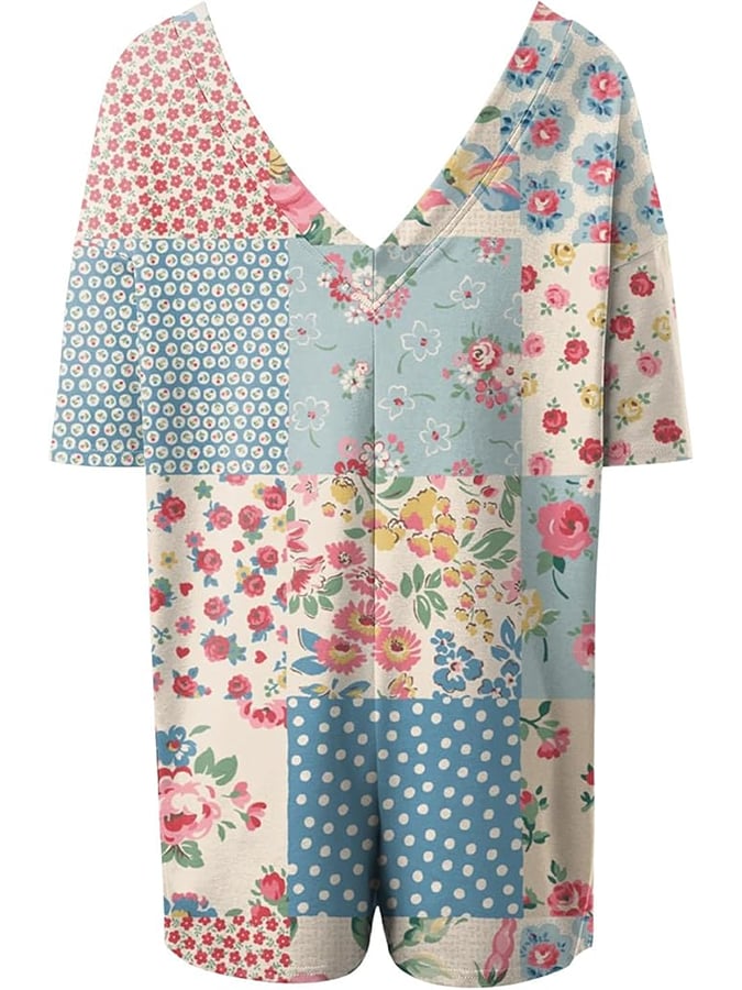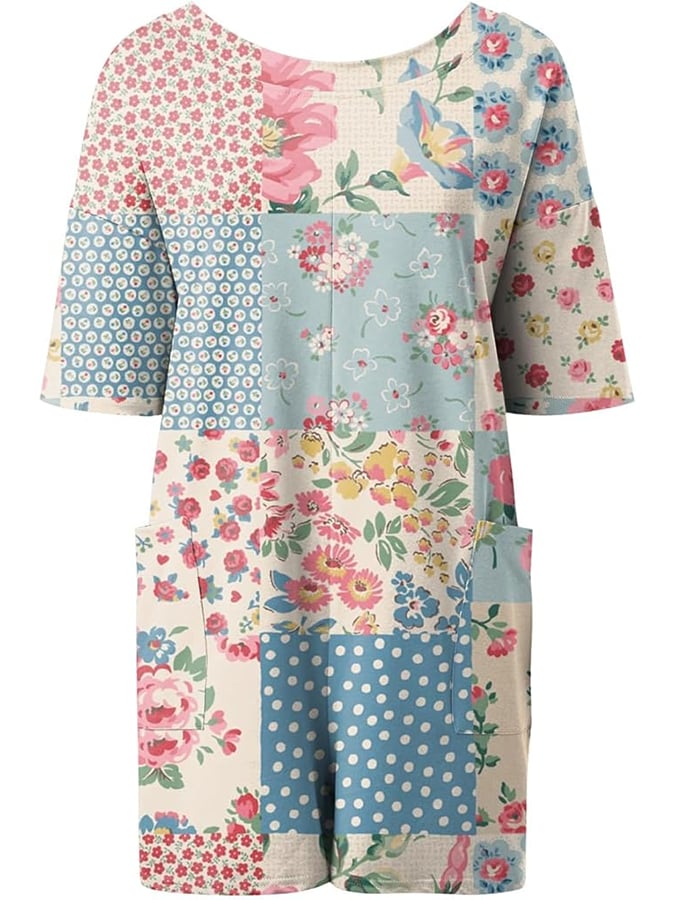 Women's Retro Botanical Floral Patchwork Art Print Casual Jumpsuit