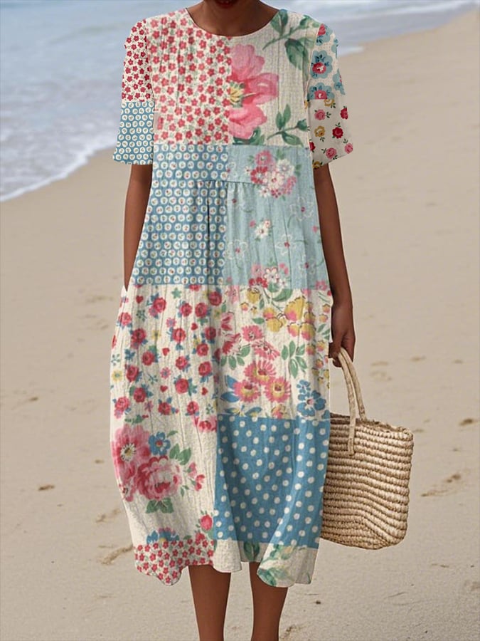 Women's Vintage Floral Print Casual Round Neck Short Sleeves Dress